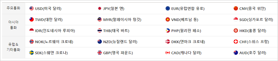 카테고리 없음 국민은행 환전 가능통화 20가지 알아보기 by leverlever 2023. 7. 5. 국민은행 환전 가능통화는 다음과 같습니다. 위 항목에 해당되지 않는 통화는 현찰로 환전할 수 없으니 사전에 꼭 체크하시기 바랍니다. 반응형 공유하기 게시글 관리 레버인사이트리치 저작자표시 비영리 변경금지 (새창열림) 댓글
