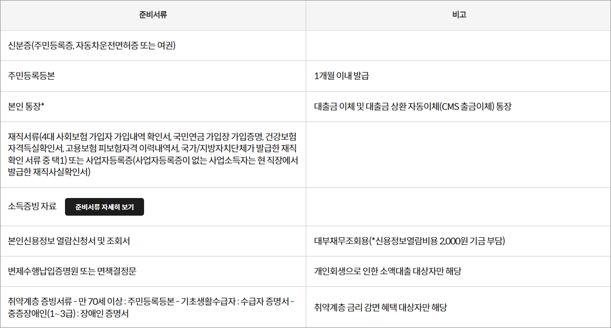 국민행복기금 소액대출 제출서류는 다음과 같습니다. *표 클릭 시, 확대가능