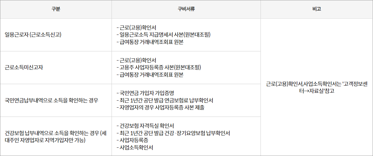 - 국민연금 및 건강보험 납부내역으로 소득을 확인하는 경우 3개월 이상 가입 및 3회 이상 납부시에만 인정하며, 대출신청일 기준 과거 1년간 1개월 이상 연체하신 경우 불인정.