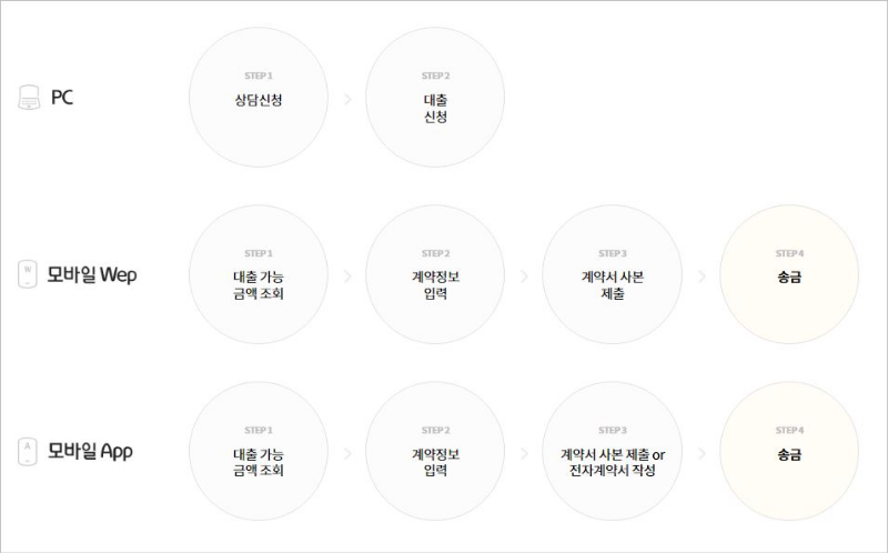 PC 웹, 모바일앱 다운로드 후, 송금까지 진행 하실 수 있습니다. 담당직원과 통화 없이 전자계약서 작성 후 바로 온라인 자동 송금이 가능합니다. *전화신청도 가능