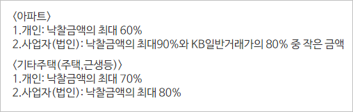- 담보/보증 필요여부 : 낙찰된 부동산, 담보 필요 / 본인 낙찰 물건에 한하여 보증 불필요