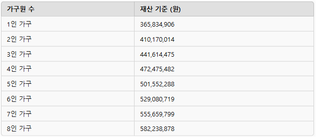 재산 기준은 가구원 수에 따라 다음과 같이 설정되어 있습니다.