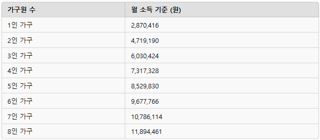 8인 이상 가구의 경우, 1인 증가 시마다 월 소득 기준이 1,108,348원씩 추가됩니다.
