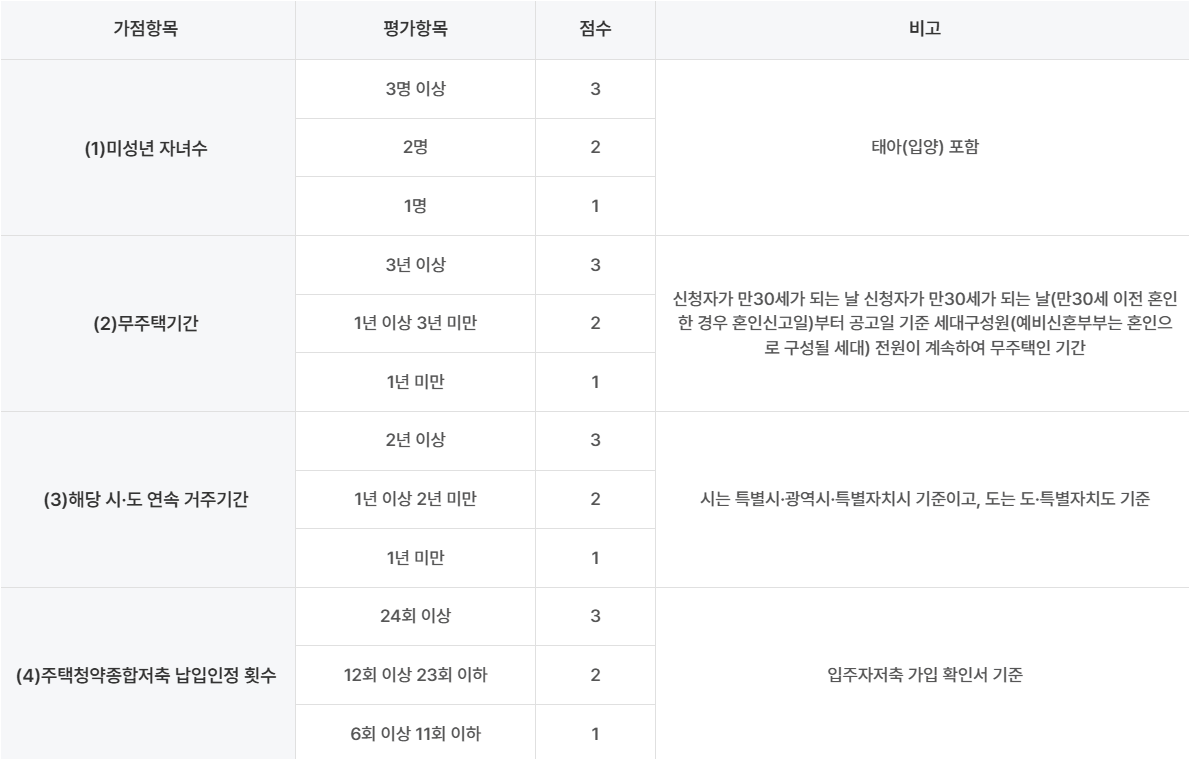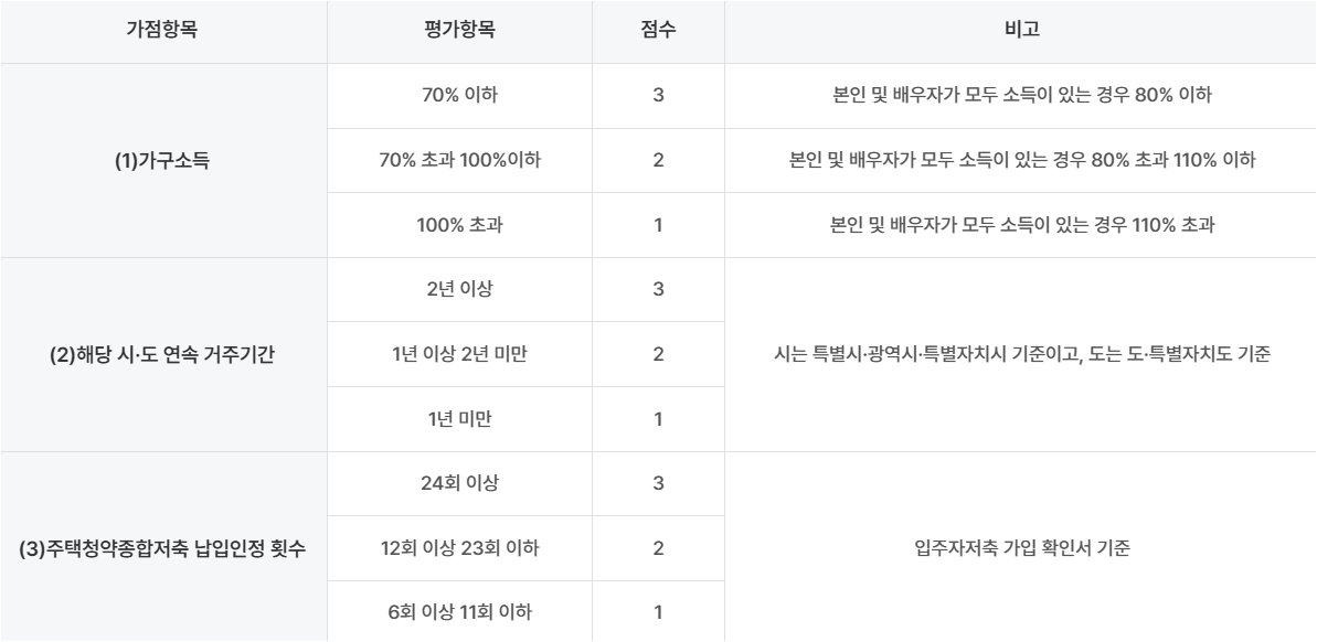 혼인기간 2년 이내이거나 2세 이하의 자녀를 둔 신혼부부와 예비신혼부부 및 2세 이하의 자녀를 둔 한부모가족 중 월평균소득 130%(본인 및 배우자가 모두 소득이 있는 경우 140%) 이하인 자에게 우선공급 배점기준표에 따라 공급