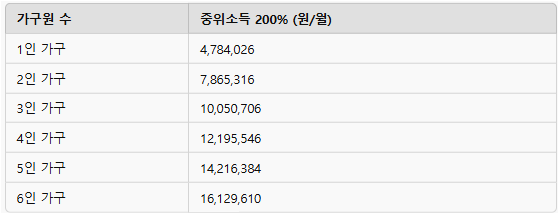 2025년 기준 중위소득은 전년 대비 6.42% 인상되어, 4인 가구 기준으로 월 6,097,773원으로 결정되었습니다. 이에 따라 중위소득 200% 이하 가구의 소득 기준은 다음과 같습니다.