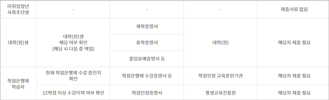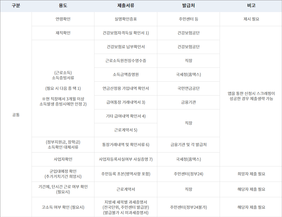 5) 장학금은 등록금 용도를 제외한 장학금(국가근로장학금 등)에 한해 인정되며 장학증서, 경력증명서 등을 제출, 정부지원금은 취업활동과 연계된 지원금(취업성공패키지 훈련참여수당 등)에 한해 인정되며 참여 확인서 등을 제출