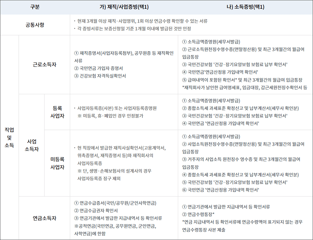 햇살론카드 제출서류는 신청자의 직종에 따라 차이가 있습니다. 다음을 참고하시기 바랍니다. *표 클릭 시, 확대 가능