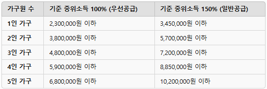 ✔ 소득 기준: 기준 중위소득 100% (우선공급), 150% (일반공급)